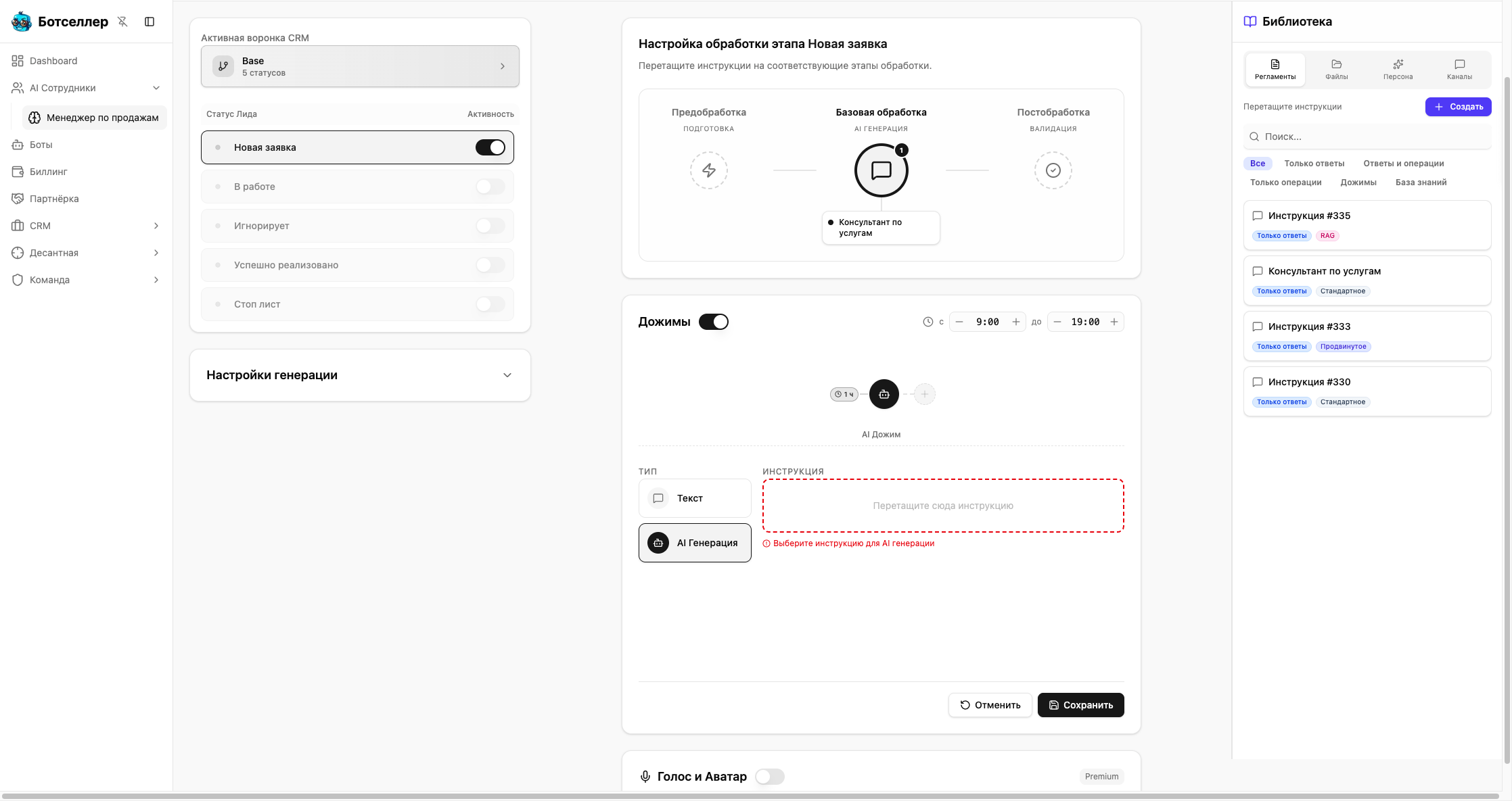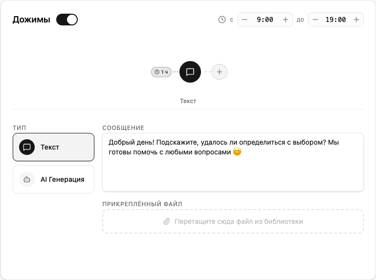 - AI Генерация — перетащите инструкцию типа «Для Дожимов» из библиотеки