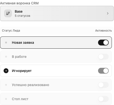 Особый статус не может иметь дожимы. Лиды переходят сюда после завершения всех попыток дожимов. Если вы попробуете включить дожимы на этом этапе — переключатель будет заблокирован.