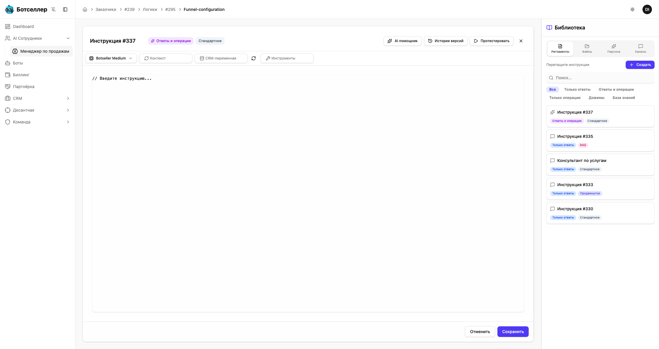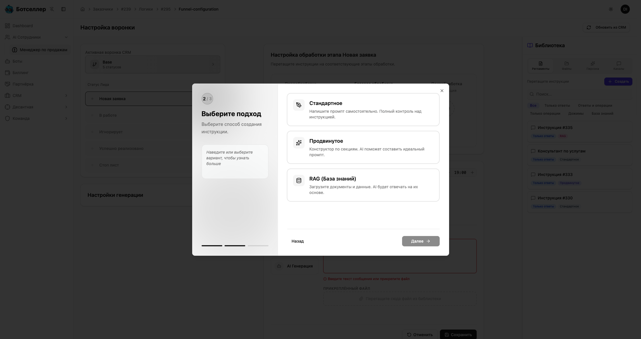 При создании инструкции мастер задаёт три вопроса: что должен делать бот (тип), как организовать промпт (метод) и кто его напишет (подход). От первого выбора — типа — зависит весь функционал: будут ли доступны CRM-инструменты, контекстные переменные и данные из CRM. Это руководство проведёт вас через каждый шаг мастера и поможет выбрать правильную комбинацию.