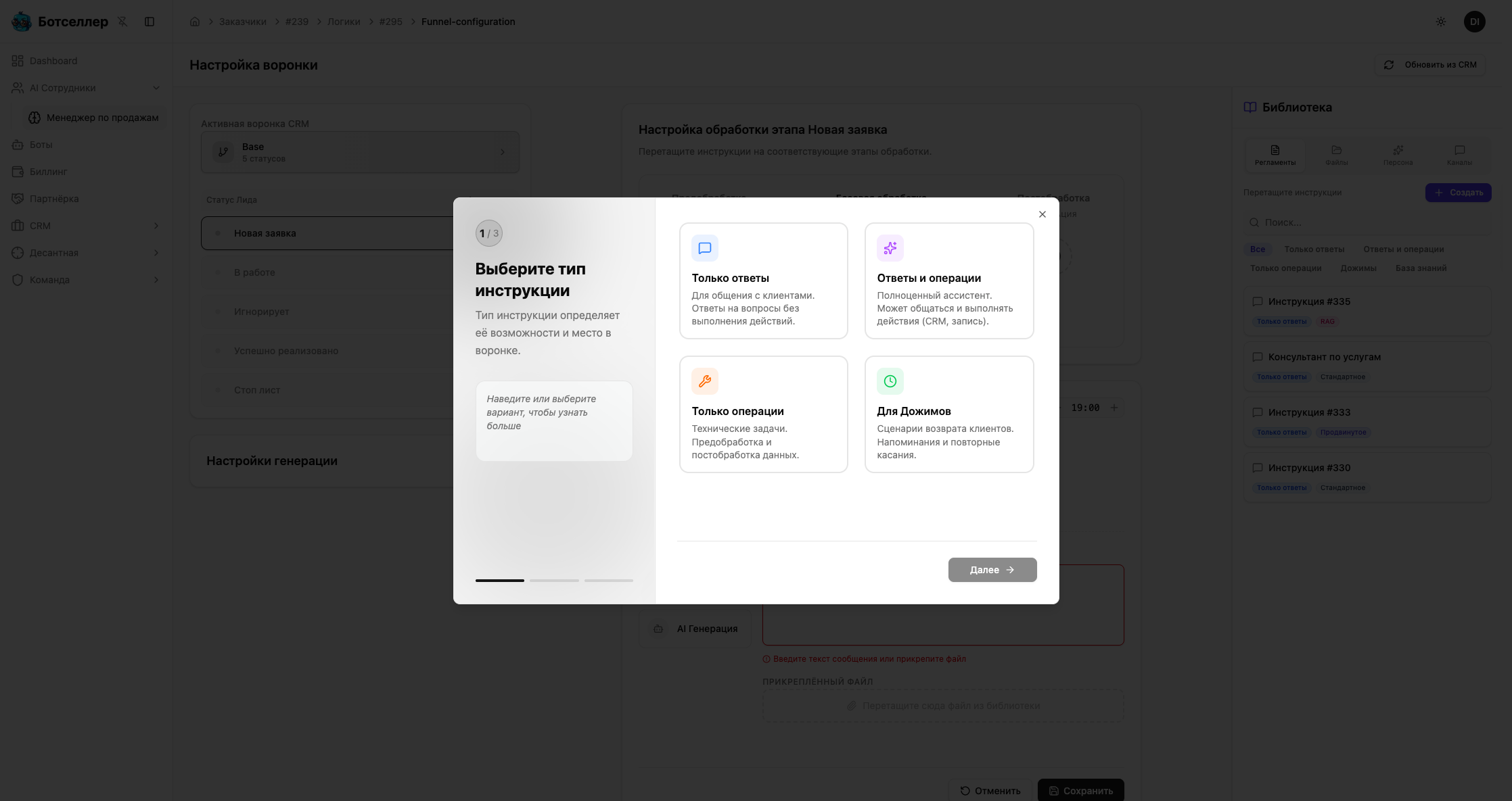 Четыре типа: «Только ответы» — для общения без CRM-действий, «Ответы и операции» — полноценный ассистент с CRM-интеграцией, «Только операции» — технические задачи (предобработка и постобработка), «Для Дожимов» — автоматические напоминания клиентам.
