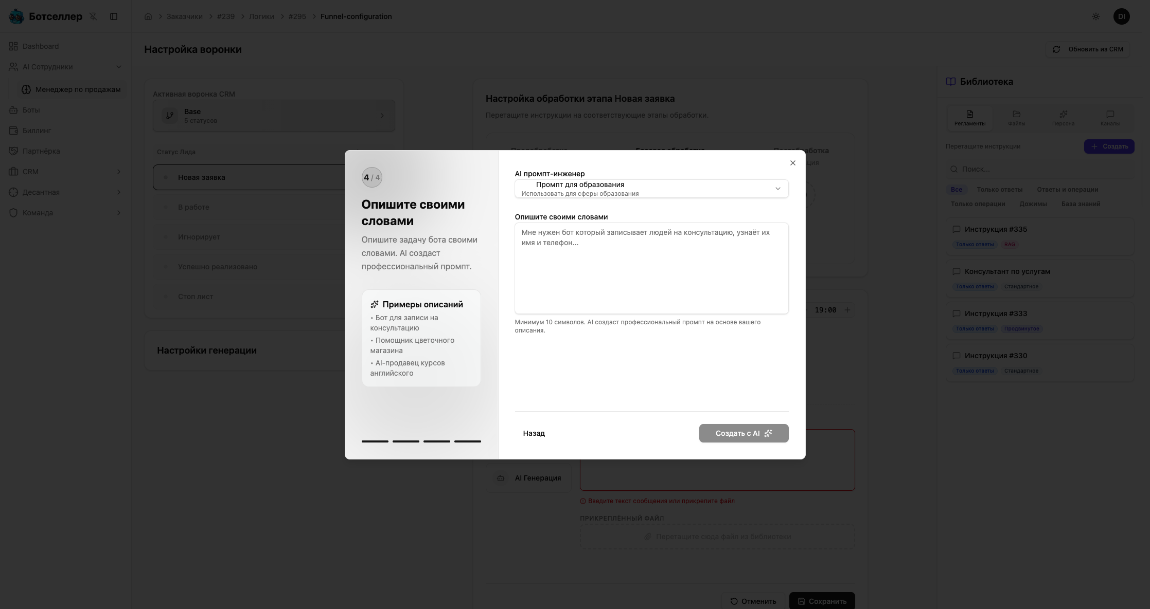 Выберите подход «С AI помощником» — опишите задачу бота обычными словами (например, «бот для записи на маникюр, который узнаёт имя и телефон»), и AI сгенерирует профессиональный промпт. Вы сможете отредактировать результат в редакторе.