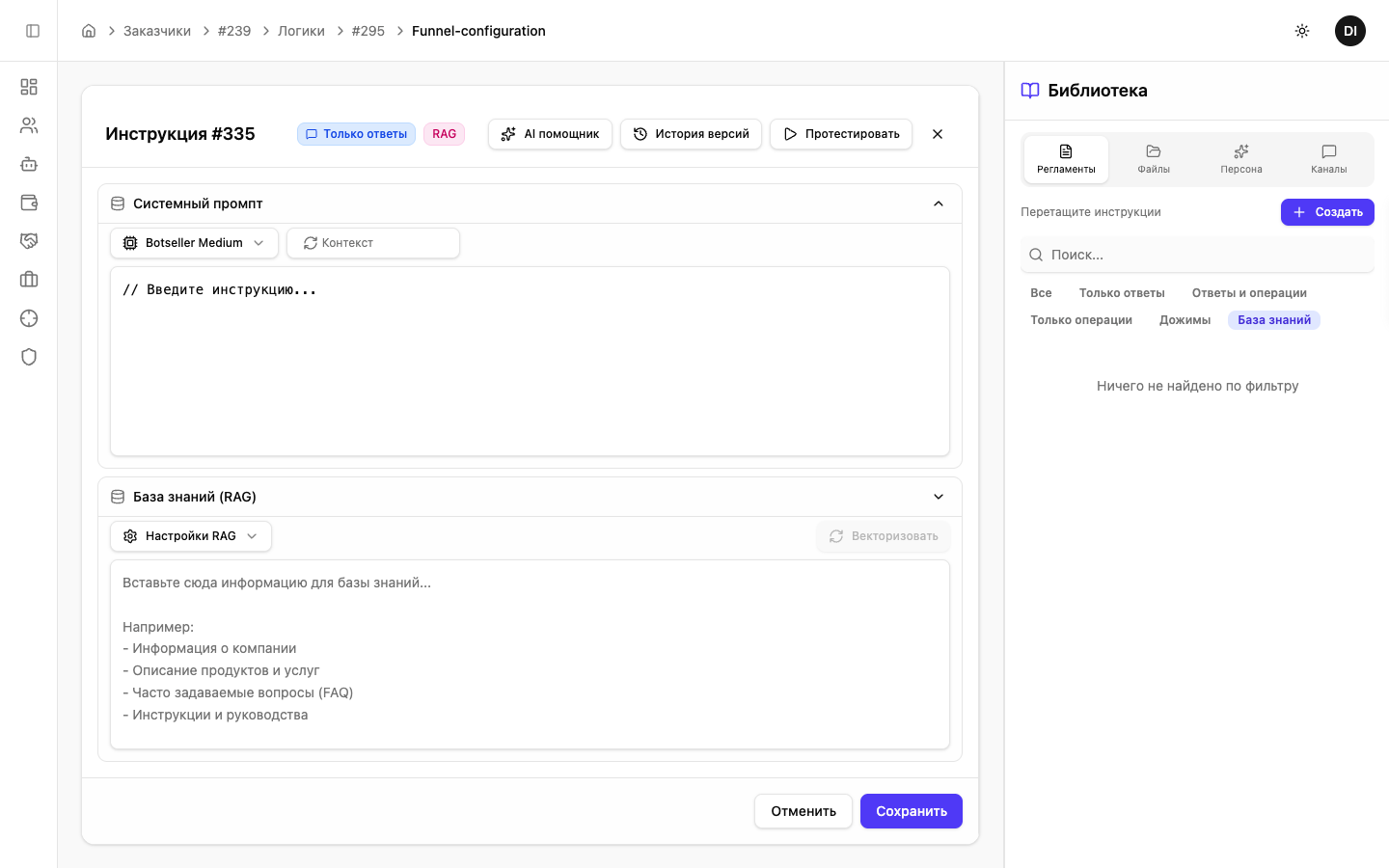 После создания откроется редактор RAG-инструкции с двумя секциями: