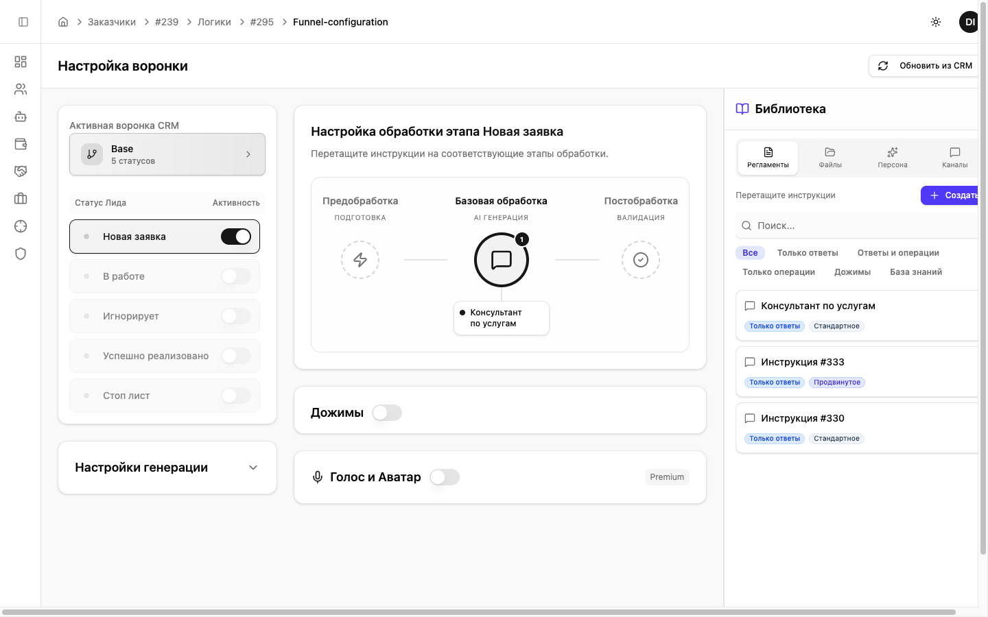 Перейдите в раздел AI Сотрудники → выберите сотрудника → нажмите «Настроить». Откроется страница «Настройка воронки»: слева — этапы, в центре — слоты обработки, справа — библиотека инструкций.