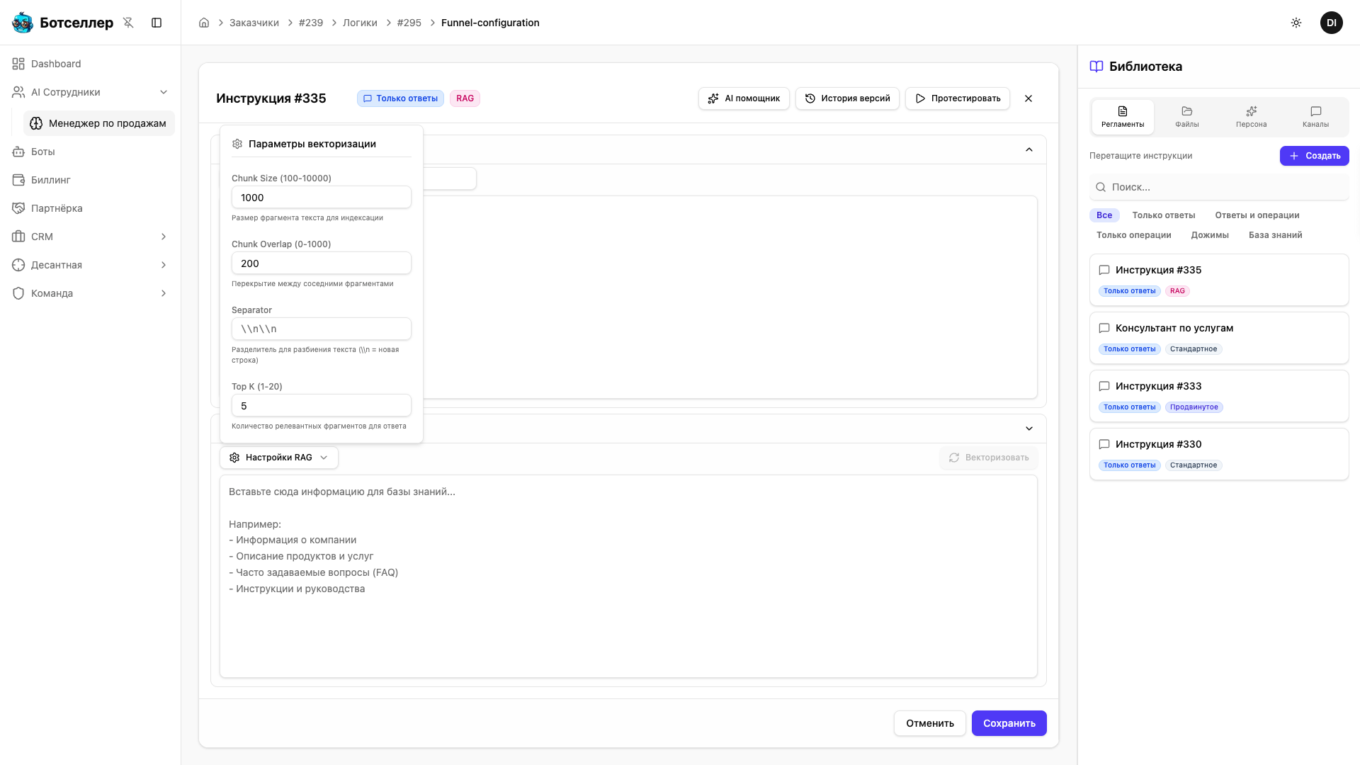 Нажмите «Настройки RAG» под полем базы знаний. Chunk Size (по умолчанию 1 000) — размер фрагментов в символах: уменьшайте для коротких FAQ, увеличивайте для длинных описаний. Top K (по умолчанию 5) — сколько фрагментов передаётся AI для ответа: увеличивайте для сложных вопросов, требующих информации из нескольких разделов. После изменения настроек нажмите «Векторизовать».