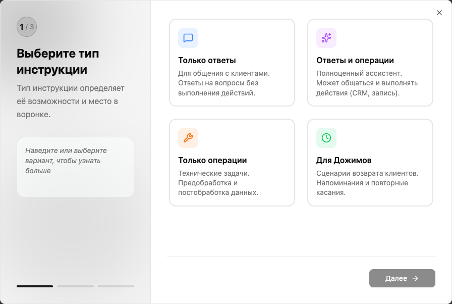Шаг 1 — Тип инструкции: выберите «Только ответы» — этот тип подходит для консультаций и ответов на вопросы клиентов.