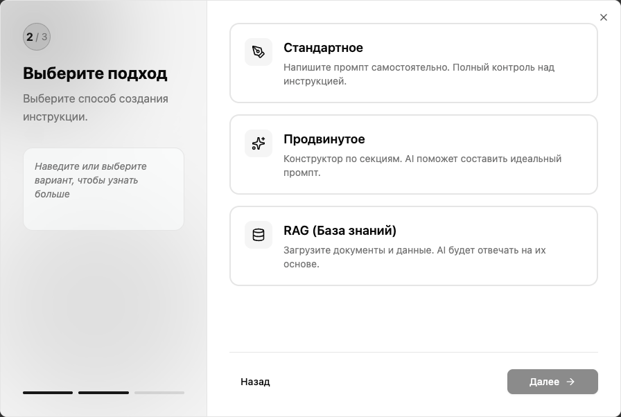 Шаг 2 — Подход: выберите «RAG (База знаний)» — AI будет отвечать на основе загруженных документов.