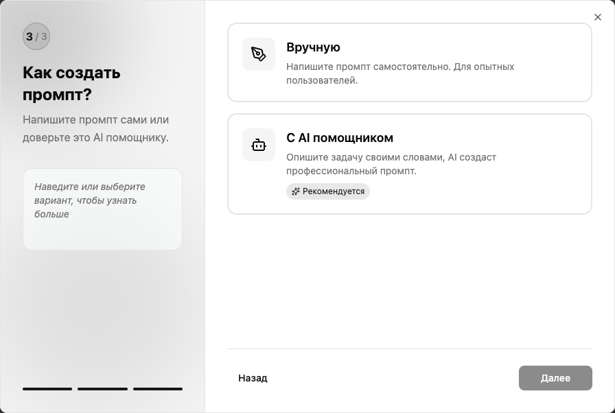 Шаг 3 — Способ создания: выберите «Вручную» для полного контроля или «С AI помощником» для автоматической генерации промпта.