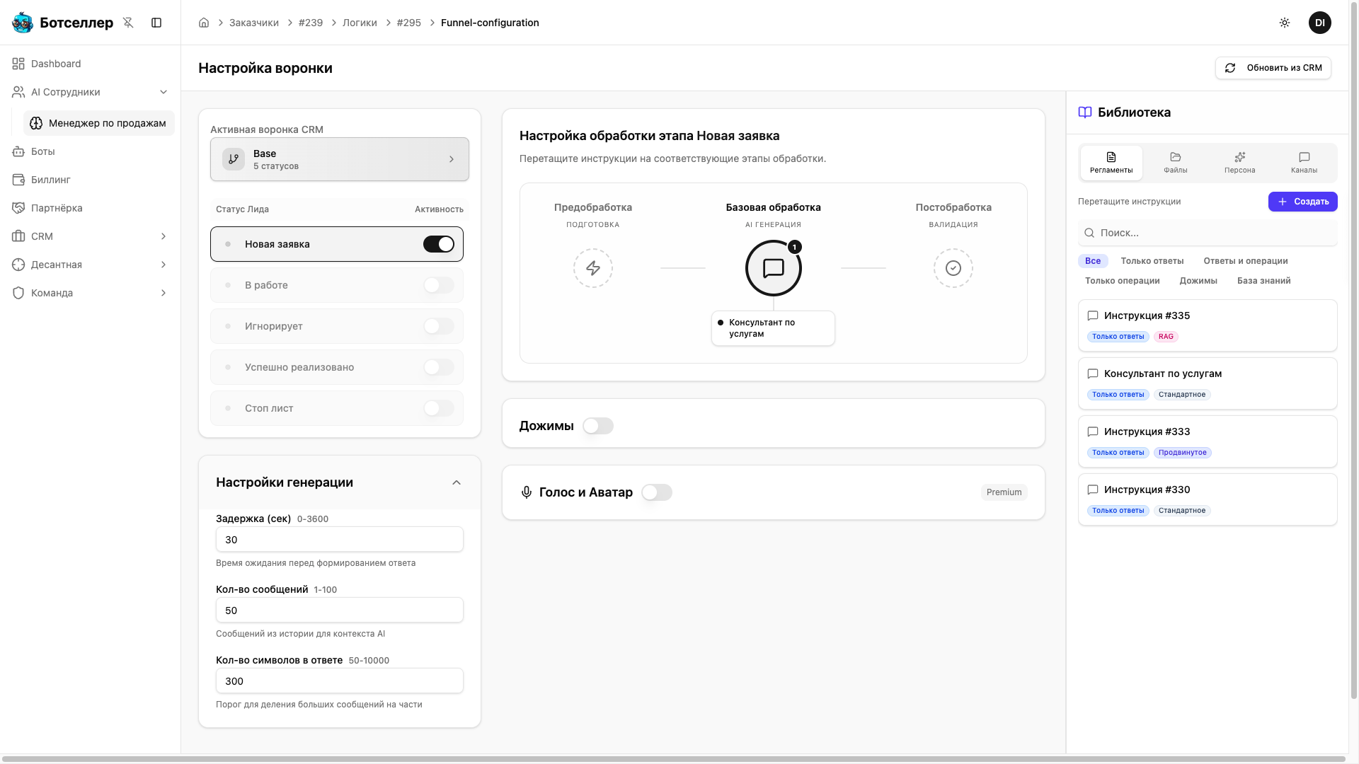Да. Одну инструкцию из библиотеки можно перетащить на несколько этапов воронки. Например, один и тот же промпт «Консультант по услугам» для этапов «Новая заявка» и «В работе». Это удобно, когда логика общения не меняется между стадиями.