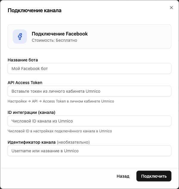 Подключение Facebook в Botseller бесплатное — за канал не взимается абонентская плата. Umnico предоставляет бесплатный тариф для одного канала. Если вам нужно подключить несколько каналов через Umnico — может потребоваться платный тариф на стороне Umnico. Актуальные цены на все каналы можно посмотреть в разделе тарифов.