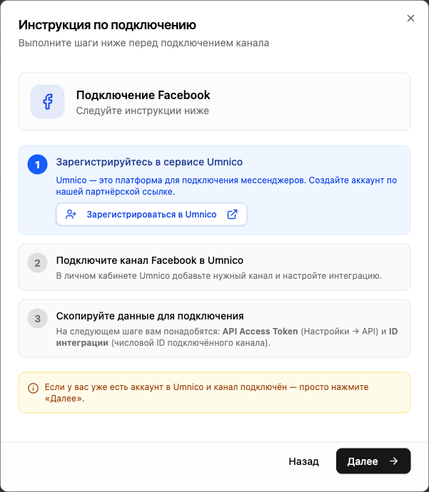 Facebook подключается через сервис Umnico — платформу-агрегатор мессенджеров. Если у вас ещё нет аккаунта, нажмите «Зарегистрироваться в Umnico» в инструкции на экране.