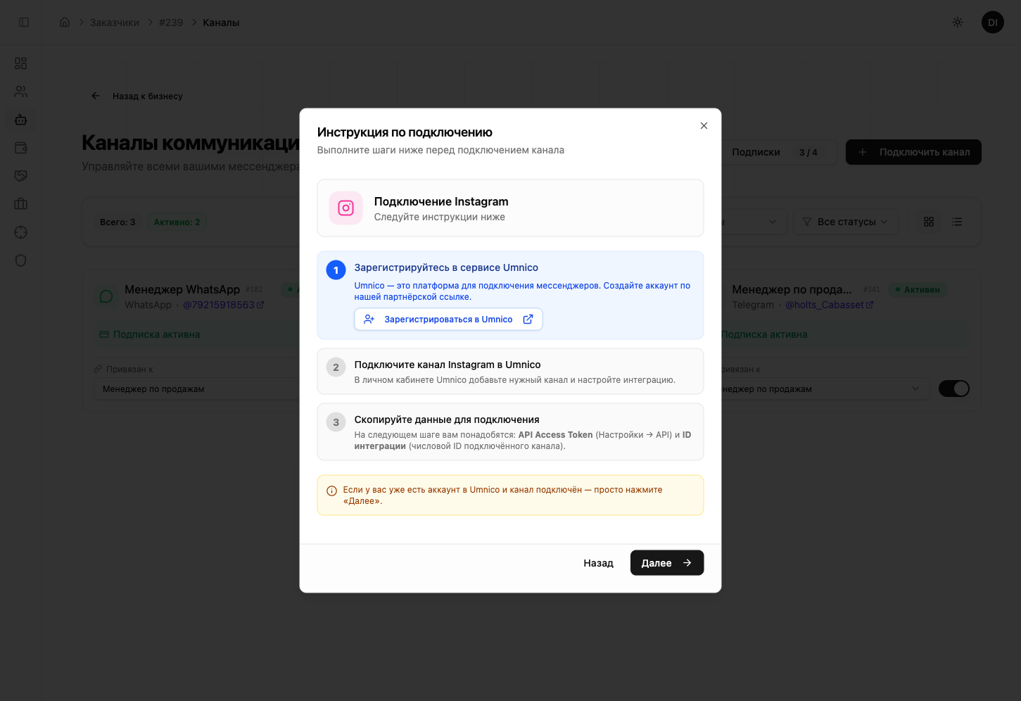 Instagram подключается через сервис Umnico — платформу-агрегатор мессенджеров. Если у вас ещё нет аккаунта, нажмите «Зарегистрироваться в Umnico» в инструкции на экране.