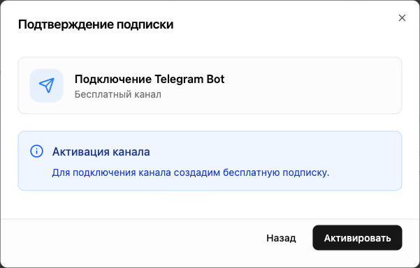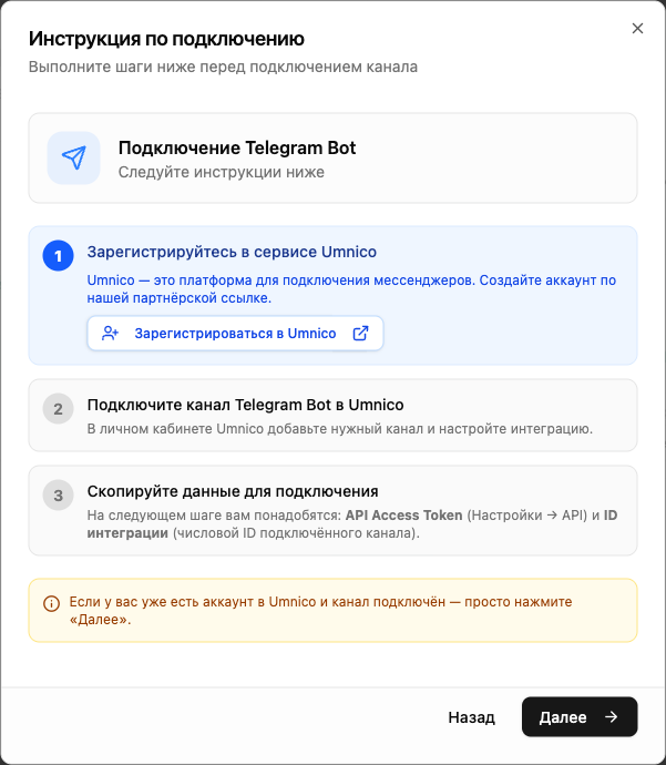 После активации подписки система покажет инструкцию по подключению. Telegram Bot подключается через сервис Umnico — платформу-агрегатор мессенджеров.