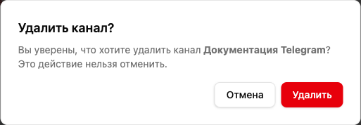 При удалении система запросит подтверждение. Удалённый канал нельзя восстановить, но подписка освободится для нового бота.