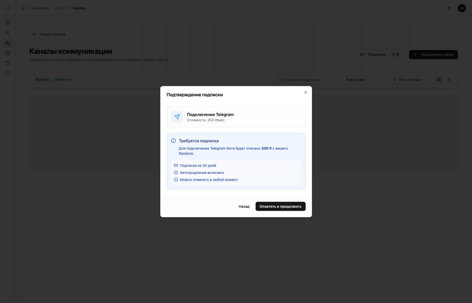 Стоимость подписки на Telegram-канал указана на странице подключения в разделе «Боты и каналы». Подписка списывается с баланса аккаунта и автопродлевается каждые 30 дней. Актуальные цены на все каналы можно посмотреть в разделе тарифов.