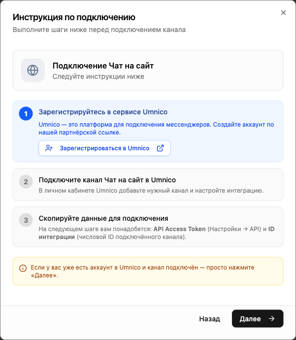 После активации подписки система покажет инструкцию по подключению. Виджет создаётся через сервис Umnico — платформу-агрегатор мессенджеров.