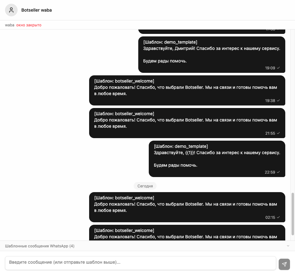Когда клиент пишет вам, открывается 24-часовое окно. В нём бот и менеджер могут отвечать свободными сообщениями. После закрытия — только шаблонные сообщения. Каждое новое сообщение от клиента продлевает окно.