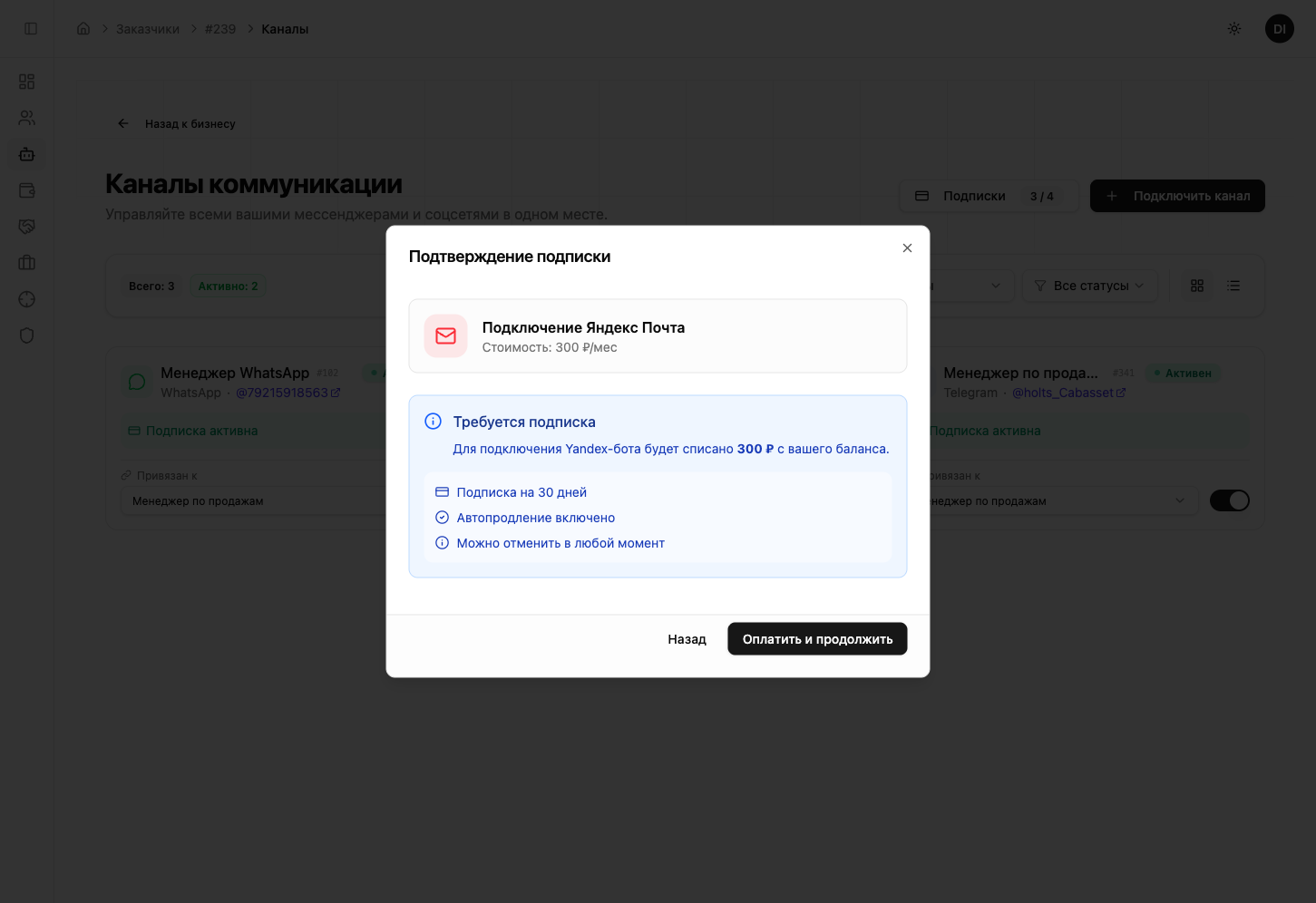 Один ИИ-сотрудник может быть привязан к нескольким каналам одновременно — Telegram, WhatsApp, Яндекс Почта и другим. Все диалоги попадают в единую CRM.