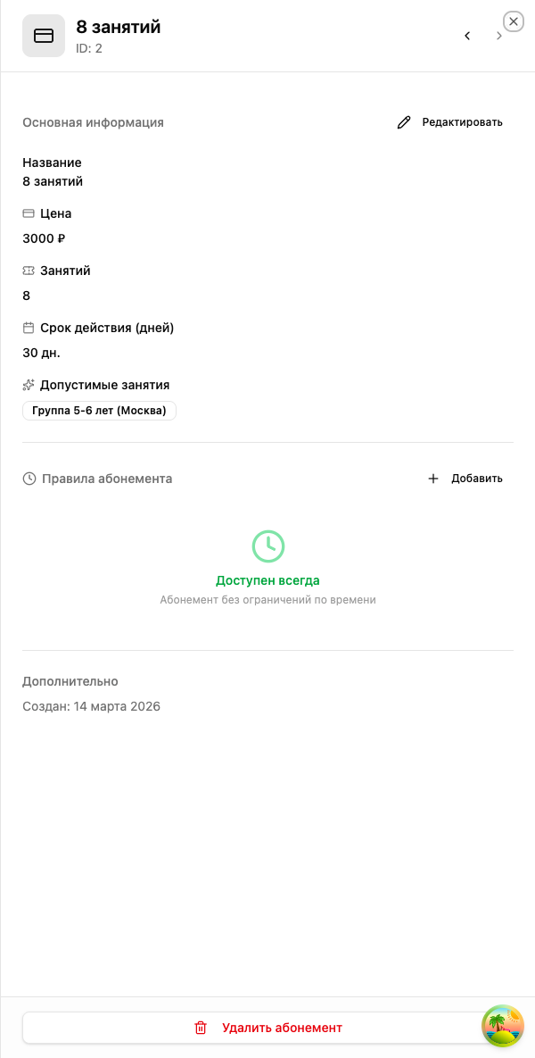 Абонемент — это подписка клиента на ваши услуги. Бывает безлимитным (ходи сколько хочешь) и по количеству посещений (например, 8 занятий). У каждого абонемента есть цена, срок действия и список допустимых услуг.