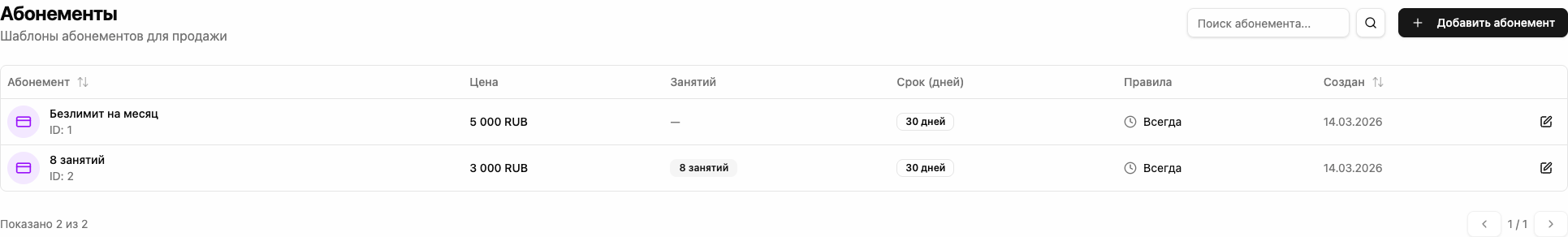 Таблица показывает шаблоны абонементов — это типы подписок, которые вы продаёте. Конкретные покупки клиентов отображаются в разделе «Продажи».