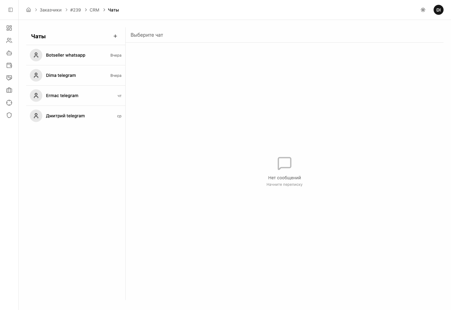 Раздел «Чаты» — это встроенный мессенджер прямо в CRM. Все переписки бота с клиентами из Telegram, WhatsApp, Instagram и других каналов собраны в одном окне. Вы можете читать диалоги, отвечать вручную и переключаться между клиентами — как в обычном мессенджере.