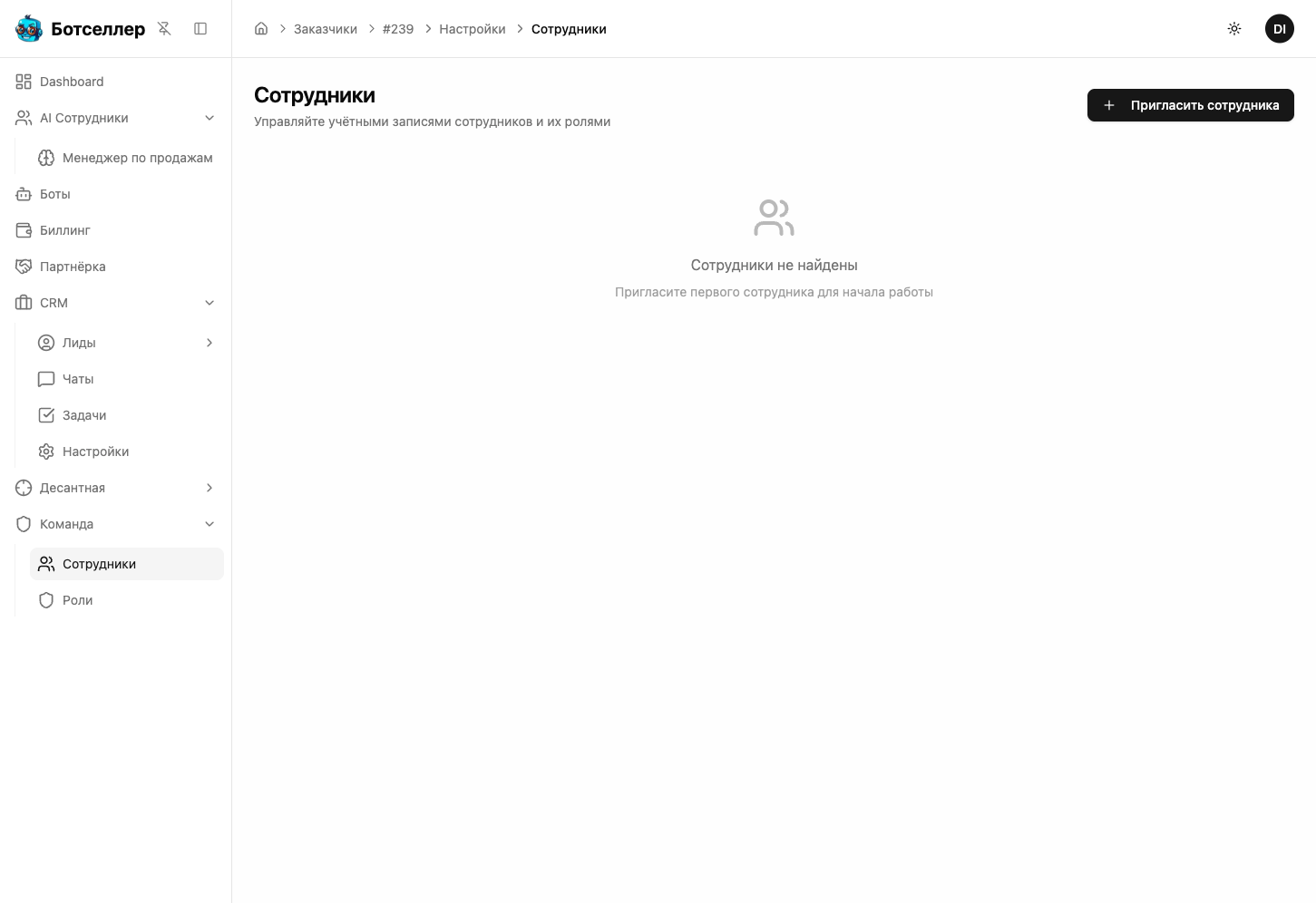 Менеджер по продажам работает с клиентами: лиды, чаты, задачи. Администратор дополнительно управляет настройками CRM, AI-сотрудниками, ботами и биллингом. Для ежедневной работы с клиентами хватает роли Менеджера.