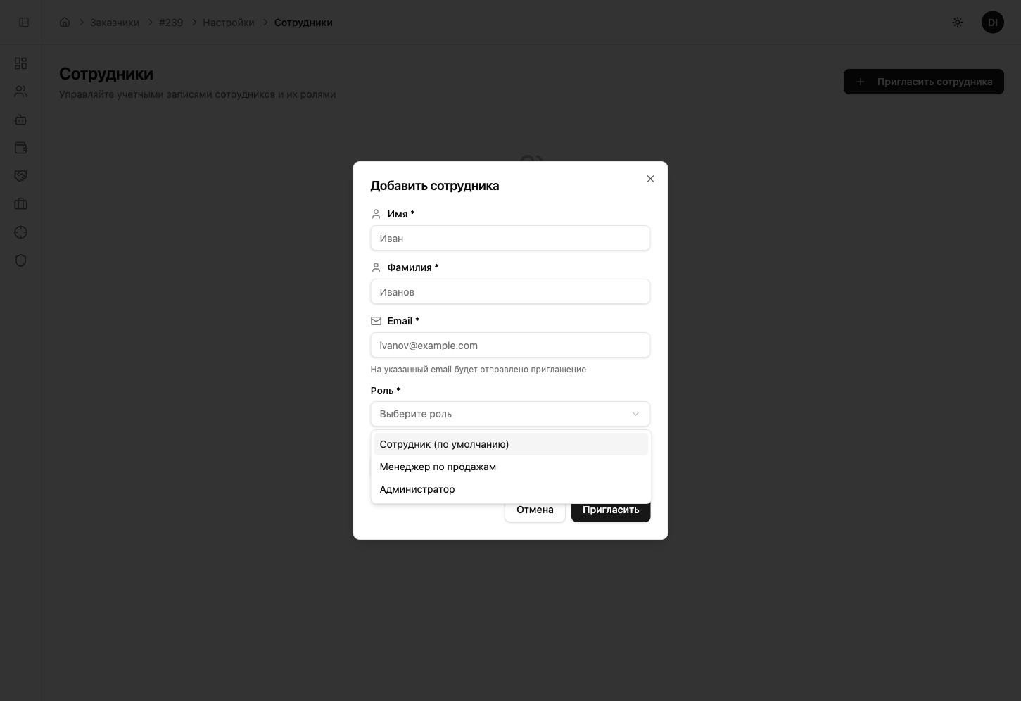 Когда вы приглашаете сотрудника, в поле «Роль» отображаются все доступные роли — системные и ваши собственные.
