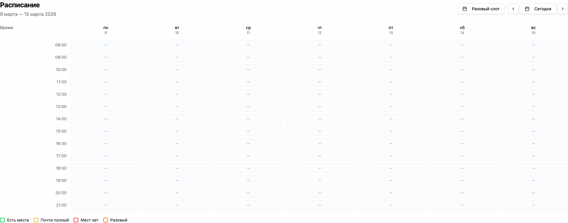 Например: «Йога, будни, с 08:00 до 20:00, слоты по 1 часу, вместимость 15 человек» → система создаст 60 слотов (5 дней × 12 часов).