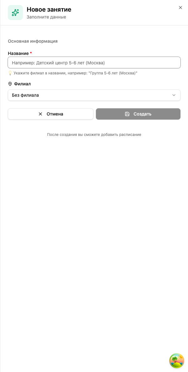 В правом верхнем углу нажмите кнопку «Добавить занятие». Откроется окно создания.