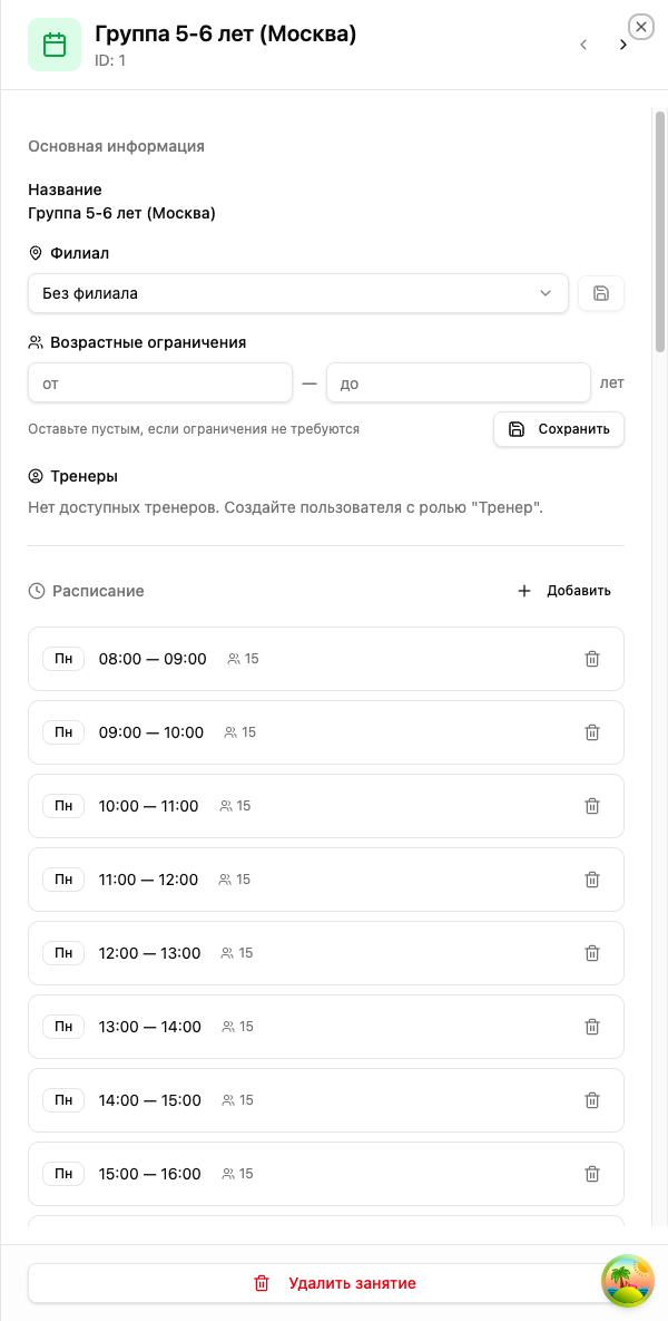 Для каждой услуги вы настраиваете расписание (дни и время), вместимость (сколько клиентов одновременно), тренера или мастера, возрастные ограничения.