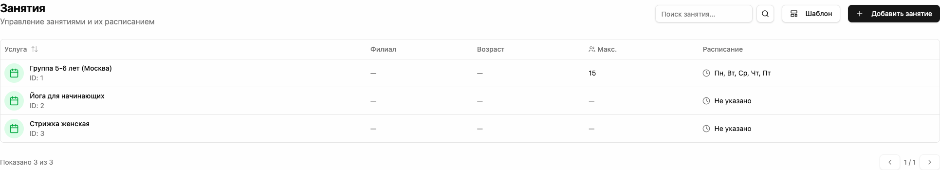 Откройте раздел «Занятия» в боковом меню CRM. Вы увидите таблицу со всеми созданными услугами.