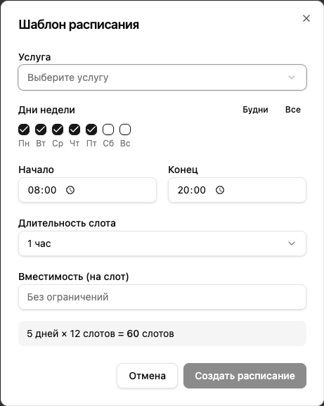 Шаблон расписания — это генератор слотов. Вместо того чтобы добавлять каждый слот вручную, вы указываете параметры — и система создаёт все слоты автоматически.