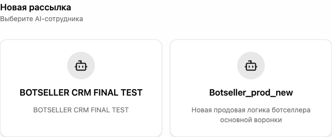 Перейдите в «Рассылки» → «Создать рассылку». На первом экране выберите AI-сотрудника, к которому привязан WABA-бот. Именно этот AI-сотрудник будет обрабатывать ответы клиентов на рассылку.