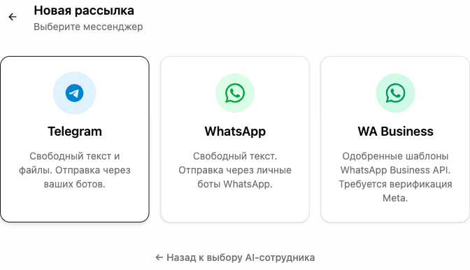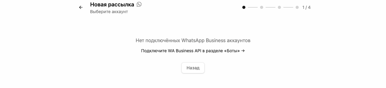 Важно: WABA-бот должен быть привязан к AI-сотруднику. Если вы подключили WABA-канал, но не привязали его к AI-сотруднику — при создании рассылки аккаунт не появится в списке. Привяжите бота в разделе «Каналы».
